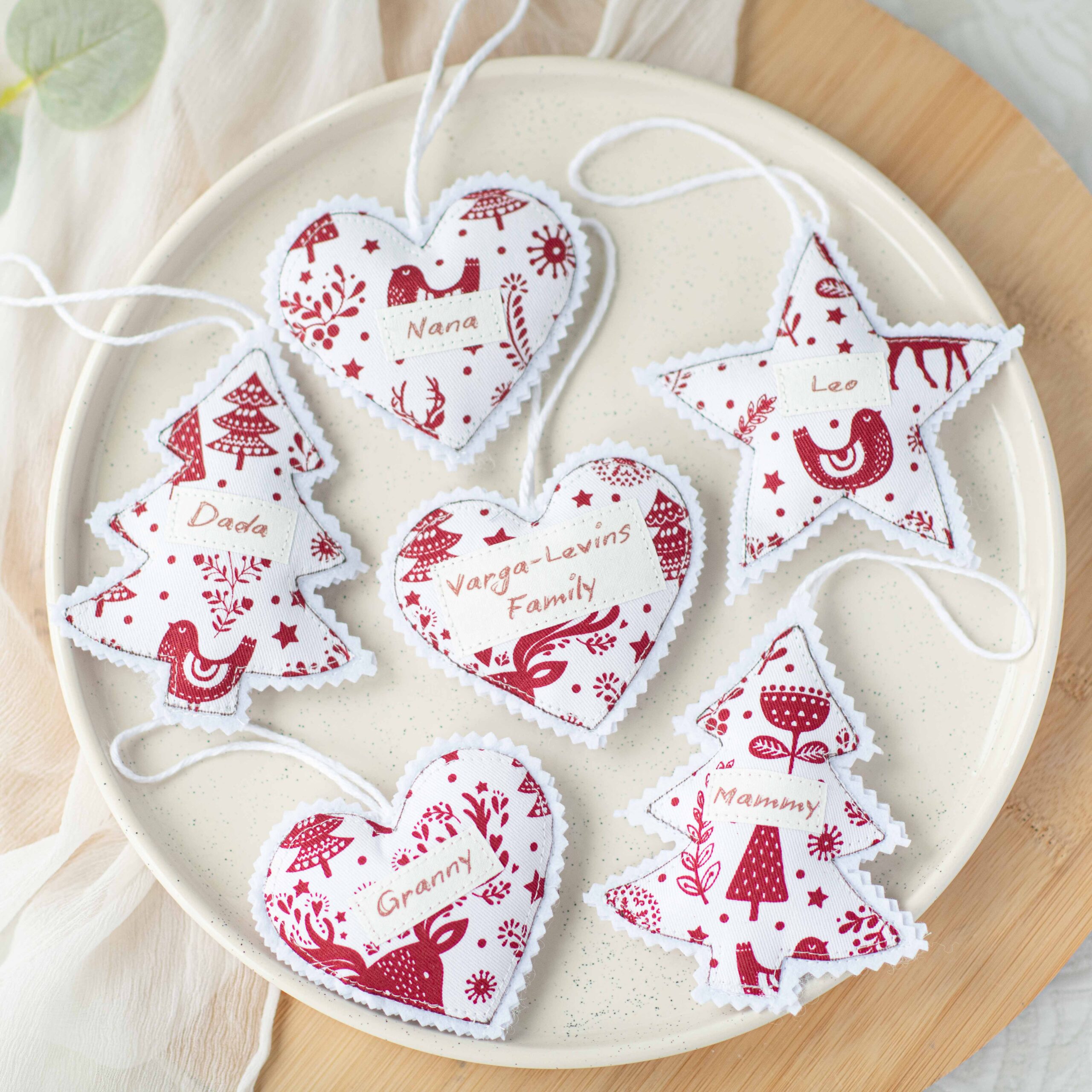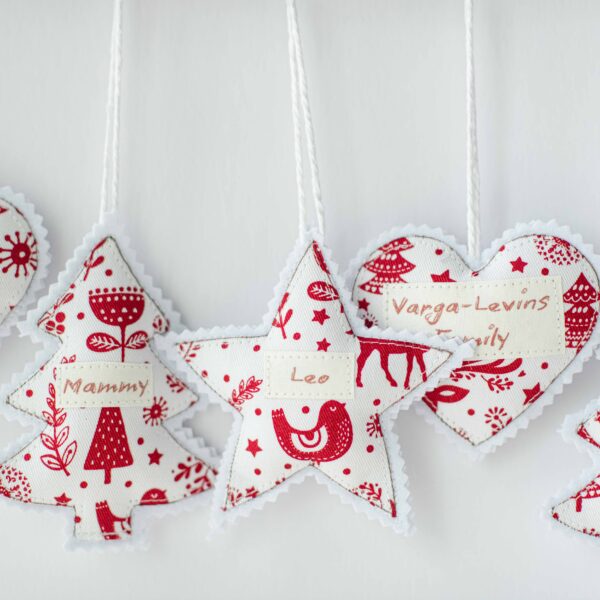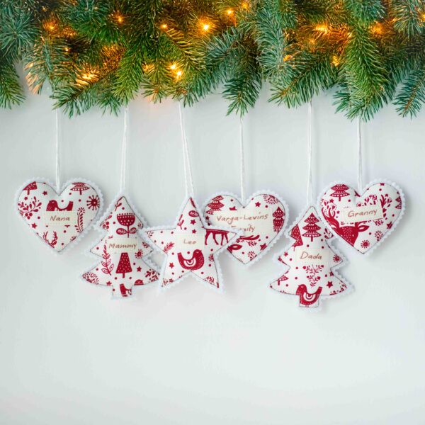 Bring a touch of heartfelt tradition to your festive season with our handmade fabric Christmas ornaments, lovingly crafted in our studio. Each piece is beautifully sewn using premium cotton fabric in a charming red and white Scandinavian-style pattern — perfect for adding warmth and personality to your Christmas tree.These ornaments are personalized with your family members’ names, making them truly one-of-a-kind keepsakes. Whether it’s Nana, Mammy, Dada, or the whole family name, each decoration is stitched with care to celebrate the people who make Christmas special.